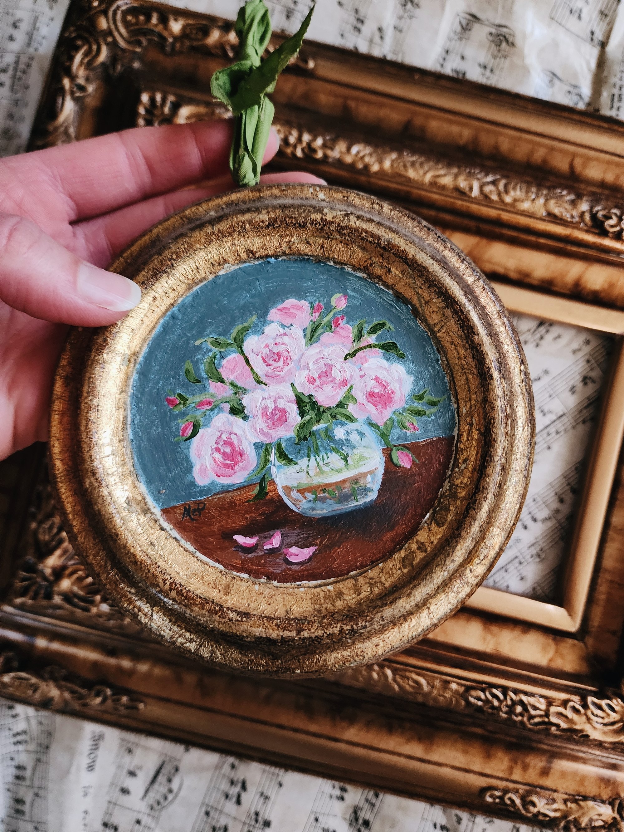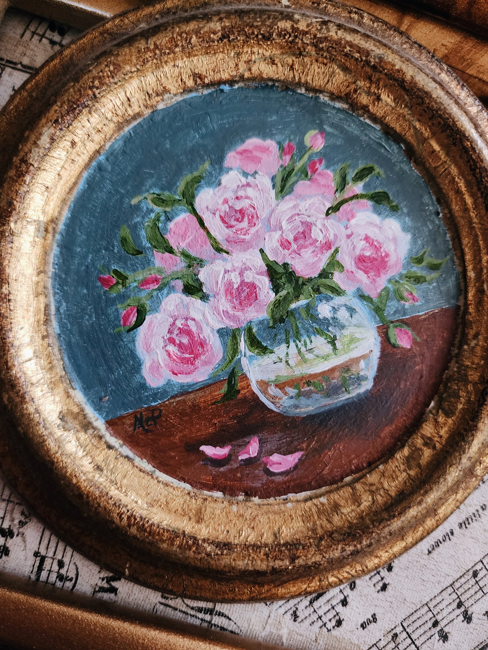 This tiny acrylic work is painted in a single piece round, wood frame measuring 4.75" across.
