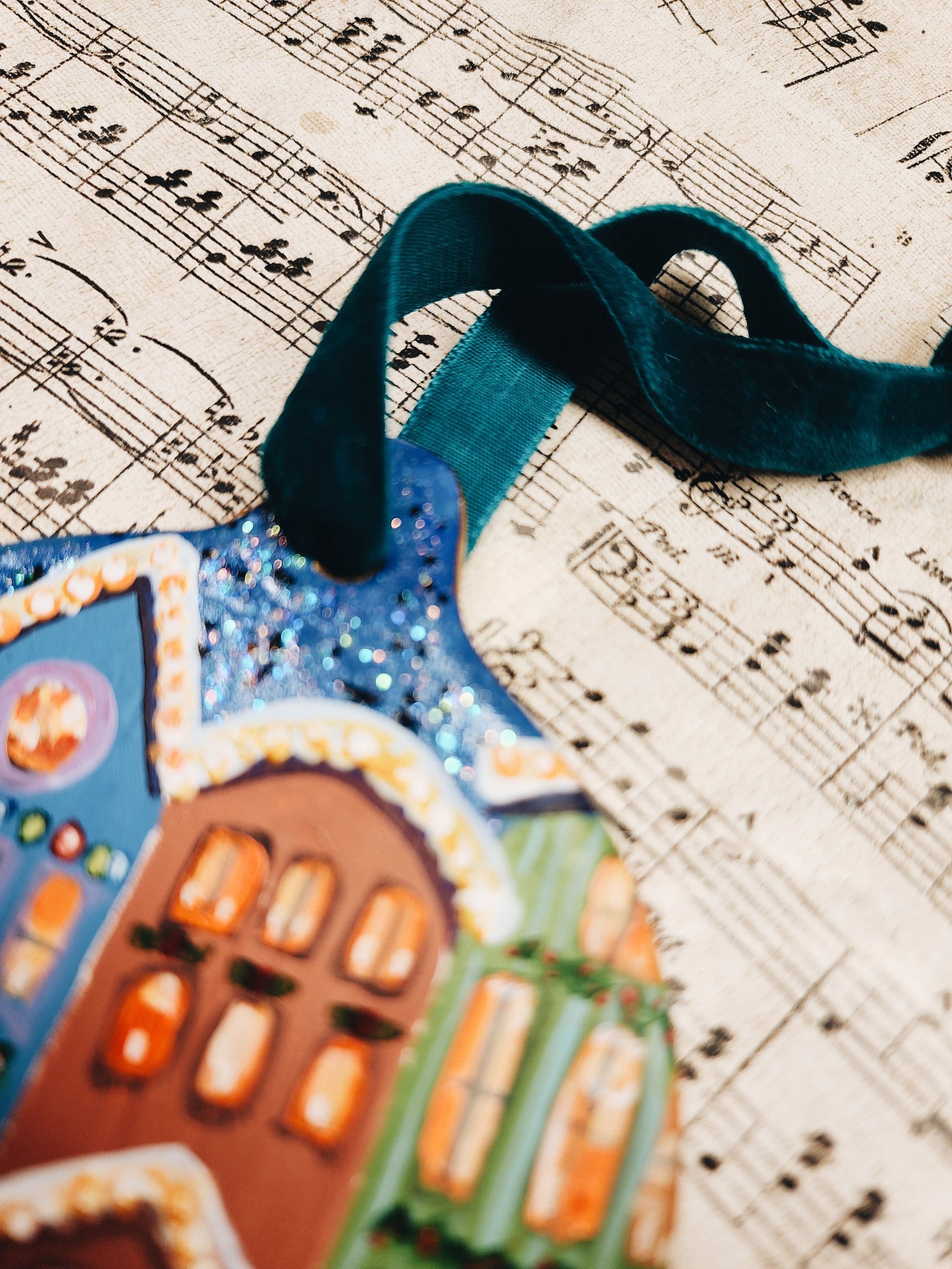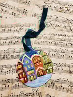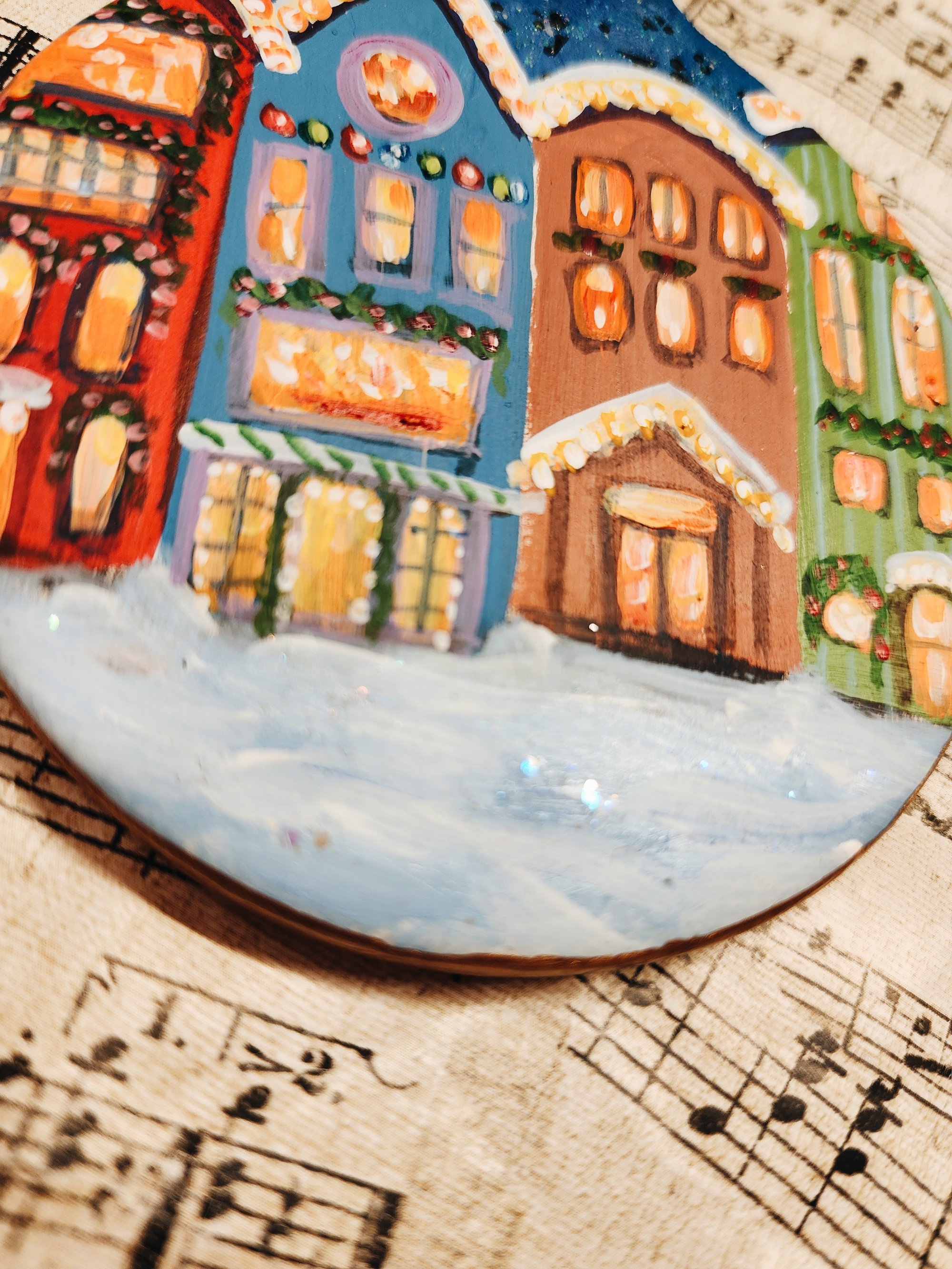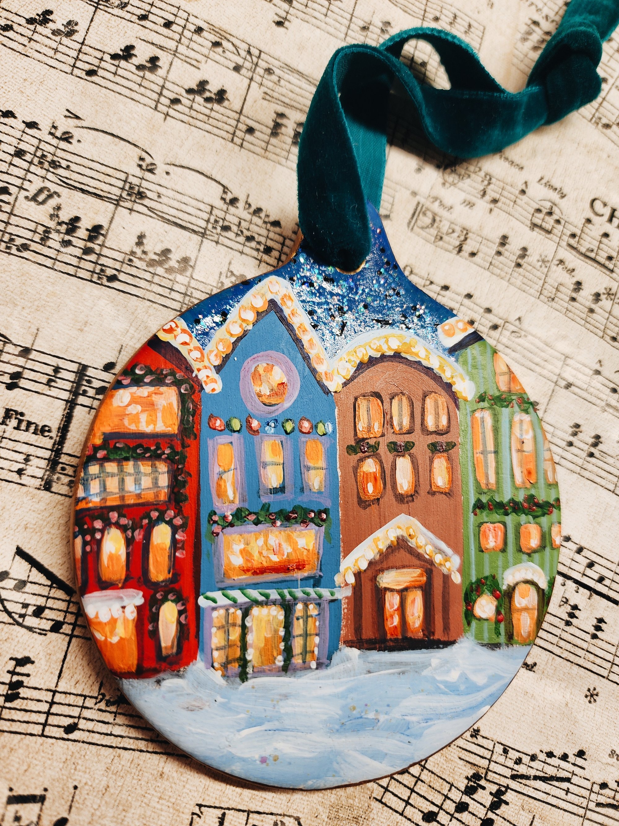 My hand-painted Cjristmas Street ornament with glittery sky and velvet ribbon is perfectly luxurious. Makes a lovely keepsake gift.